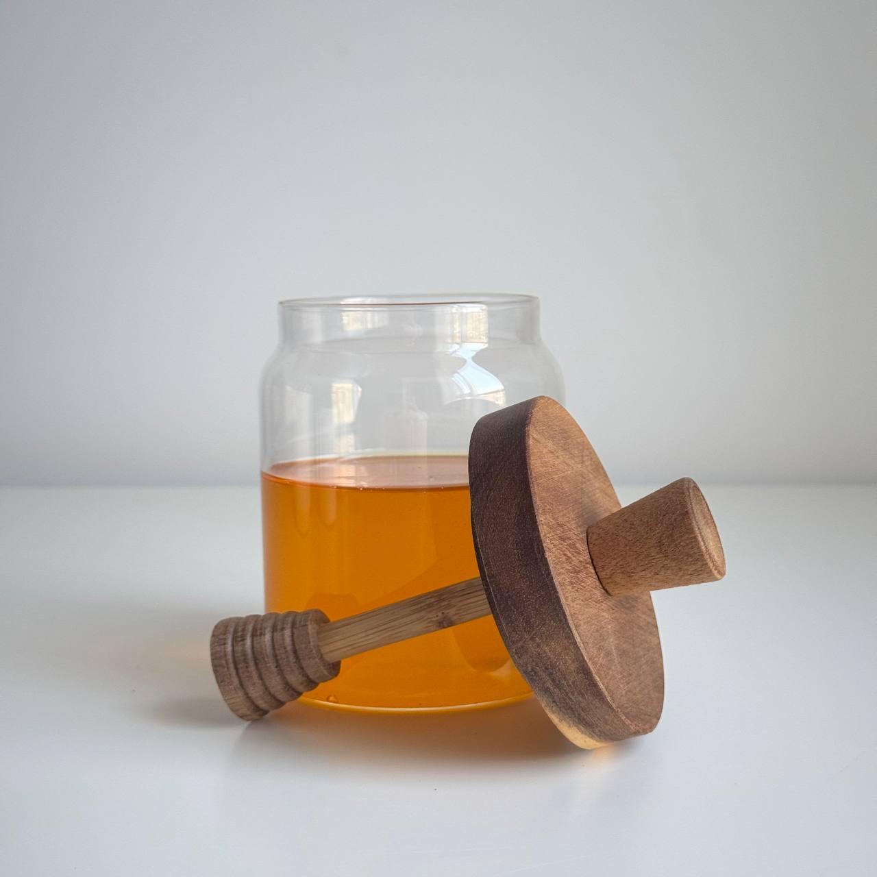 Медівниця з дерев'яною ложкою та кришкою об'ємом 500 мл – стильна та зручна ємність для зберігання натурального меду. Виготовлена із міцного прозорого скла, що дозволяє контролювати рівень вмісту. Кришка щільно закривається, захищаючи мед від сторонніх запахів та забруднень. У комплекті йде дерев'яна ложка, зручна для акуратного набору та подачі меду. Така оригінальна баночка для меду гармонійно впишеться в інтер'єр кухні, стане не лише функціональним, а й декоративним елементом. Ідеальний вибір для зберігання меду вдома чи в кафе.